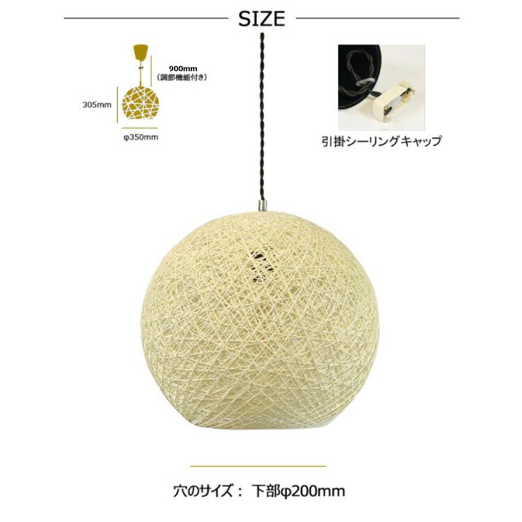 【製品仕様】 シェード サイズ シーリングカバー:Φ95mm シェードサイズ: (約)直径350mm×高さ305mm 穴のサイズ: 下部φ200mm シェード 材質 紙紐 シェード カラー アイボリー 口金 E26 点灯方式 壁:ON/OFF プラグタイプ (引掛け)シーリング用 電源コードの長さ (約)800mmコード調節器がカップ内に付属しています。