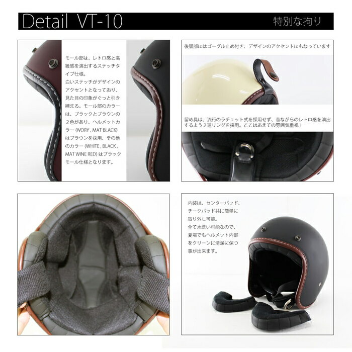 安全面でも拘り、PSC / SG規格取得品ですので、排気量を問わず全てのライダーにご提供出来ます! 商品名: NEO VINTAGE SERIES VT-10 規格/適合:SG・PSC規格/全排気量対応 適合:ユニセックス(男女兼用) サイズ:FREEサイズ(約57〜59cm未満) (スリム帽体の為、小さめのサイズ感です) カラー:WHITE、IVORY、BLACK、MAT BLACK、MAT WINE RED 待望のNEO VINTAGE SERIES第4弾は、SG規格(ヘルメットの安全基準)を満たしつつ、極限まで最小化した新型シェルを採用し、70年代風の小振りなスモールジェットヘルメットを再現! ●近年の安全基準の厳格化で巨大化しているジェットヘルメットの概念を払拭する小振りなフォルム。